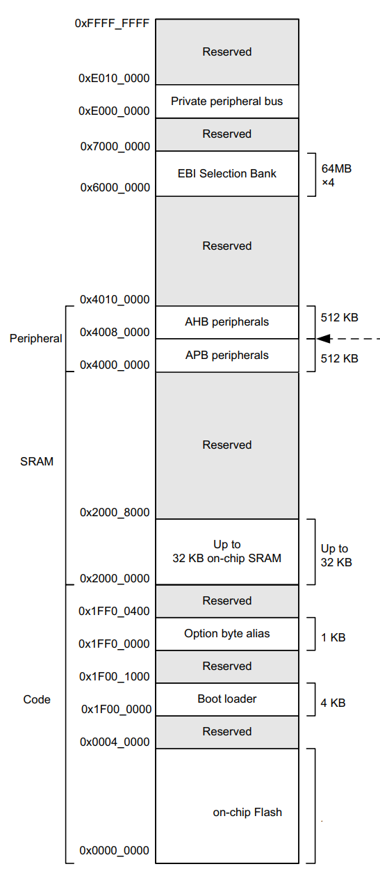HT32 内部存储器都映射到一个连续的地址上,供参考: