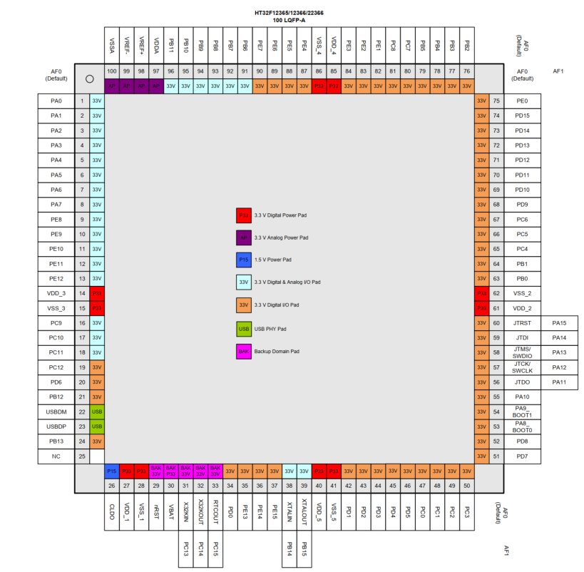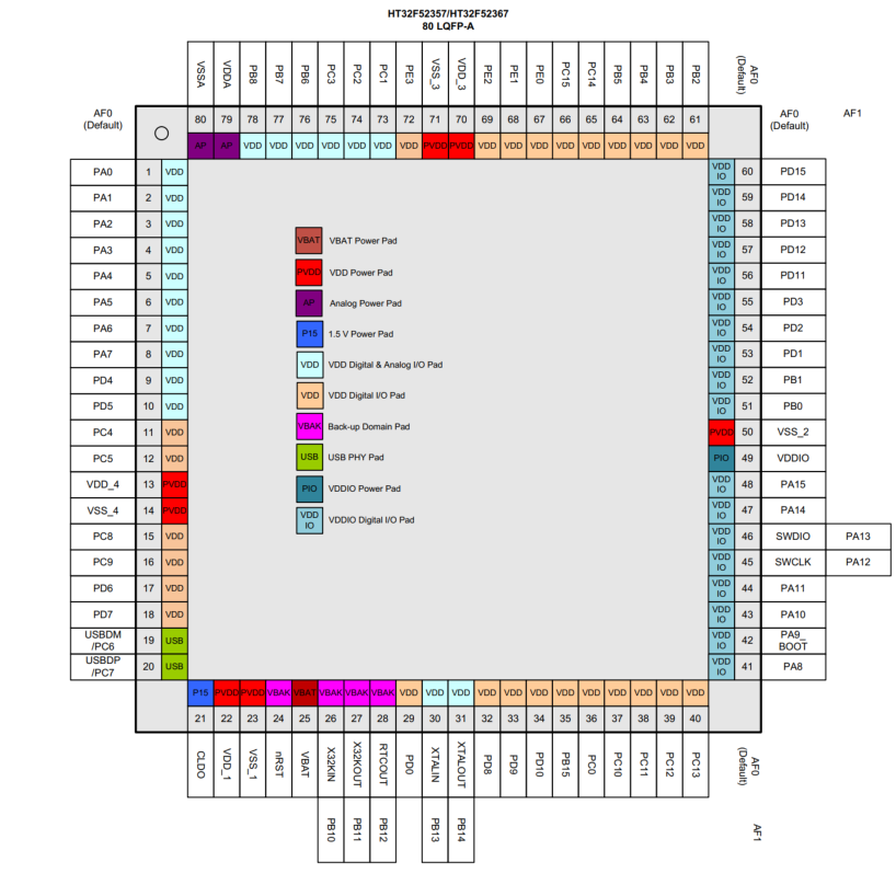 HT32 可以从 引脚图 中看出, GPIO 所对应的电源域,因不同 GPIO 所对应的电源域不同,在不同状态时需注意高低电平的电位。