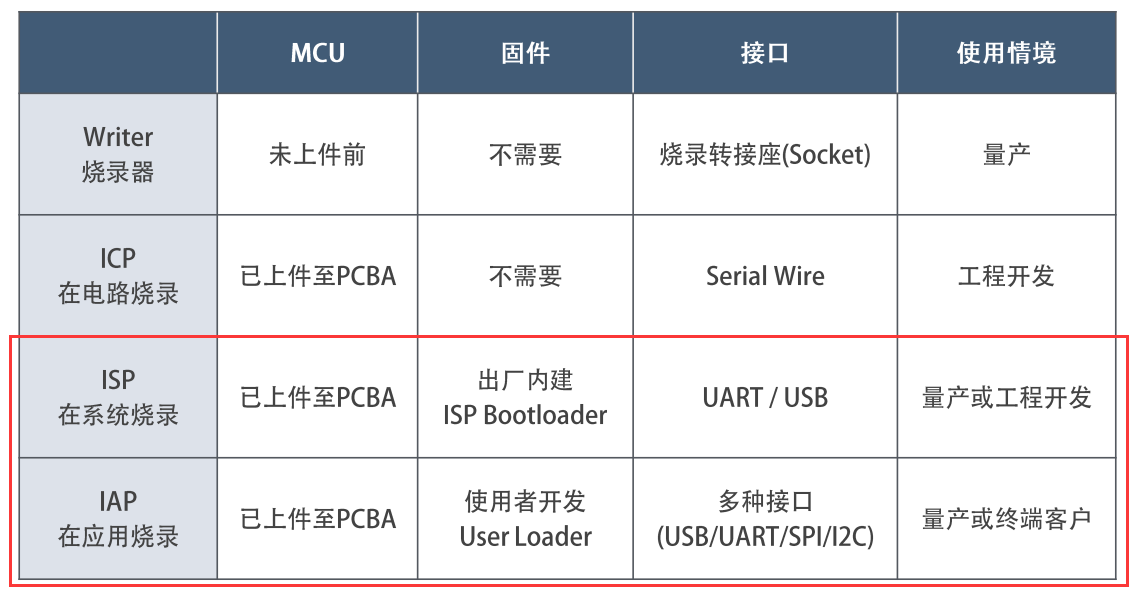 IAP :用户自行编写程序,通过通讯获得更新固件,并实现MCU自行烧录内部FLASH,功能和