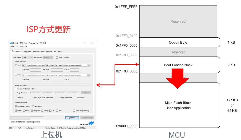 将程序跳转到 Bootloader 区域运行 ,使用 上位机 HT32_Flash_Programmer 可通过 USB/UART 接口和 HT32 通讯,