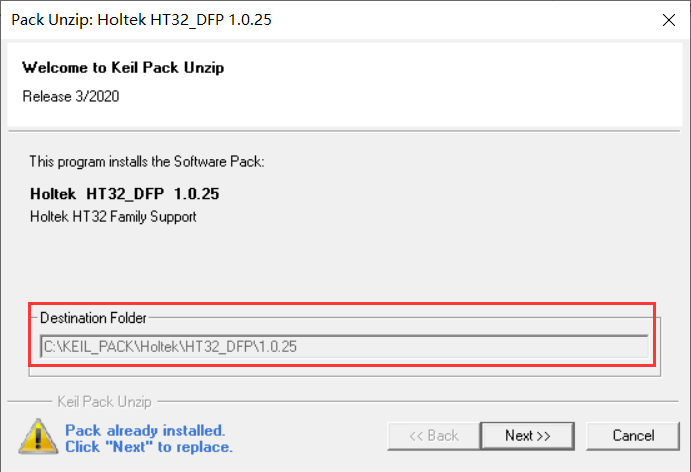 Holtek.HT32_DFP.1.0.xx.pack补丁包。安装包会自动检测安装地址, 请确认keil 5安装地址 ,一直点下一步即可。
