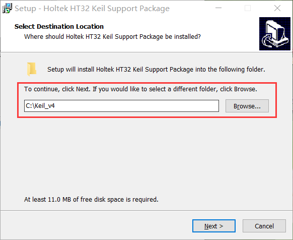 HT32 Keil Support Package_V1.0.xx.exe补丁包。 安装包会自动检测安装地址, 请确认keil 4安装地址 ,一直点下一步即可。