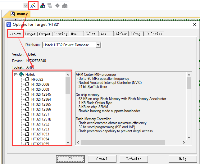 打开KEIL4的Pack管理,可以看到Holtek HT32系列型号列表,说明安装完成。