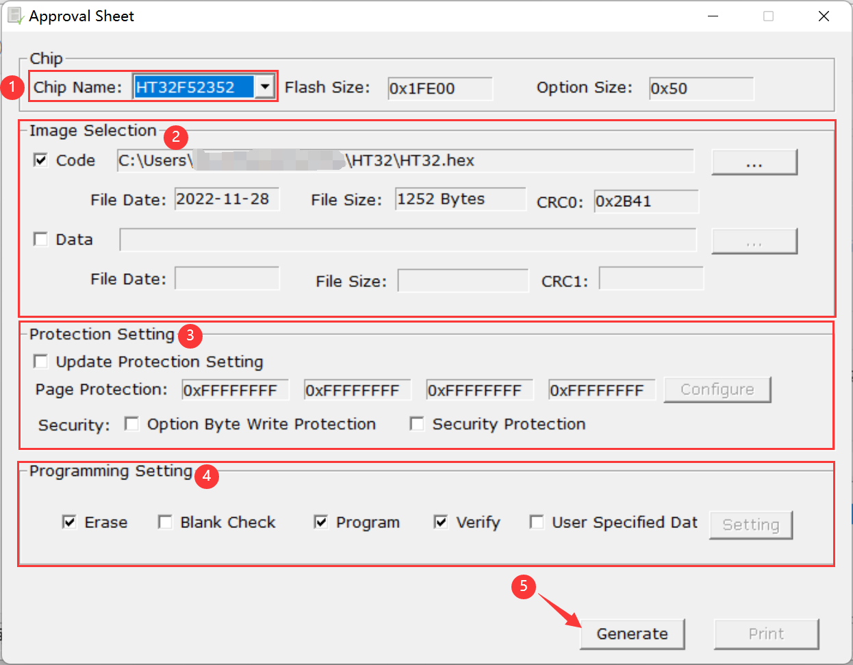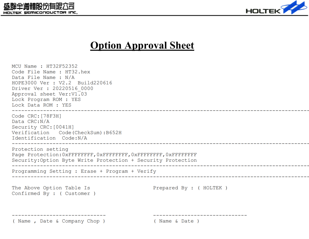 因为 HT32 工程编译生成的烧录档 x.hex/x.bin 没有 Protection Setting 保护设置 信息,所以需要 Approval Sheet 导出烧录档 .h32 。