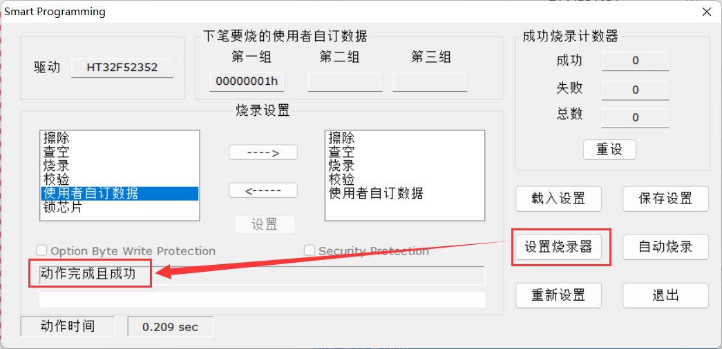 智能烧录配置,设置到当前的烧录器 e-writer32 。