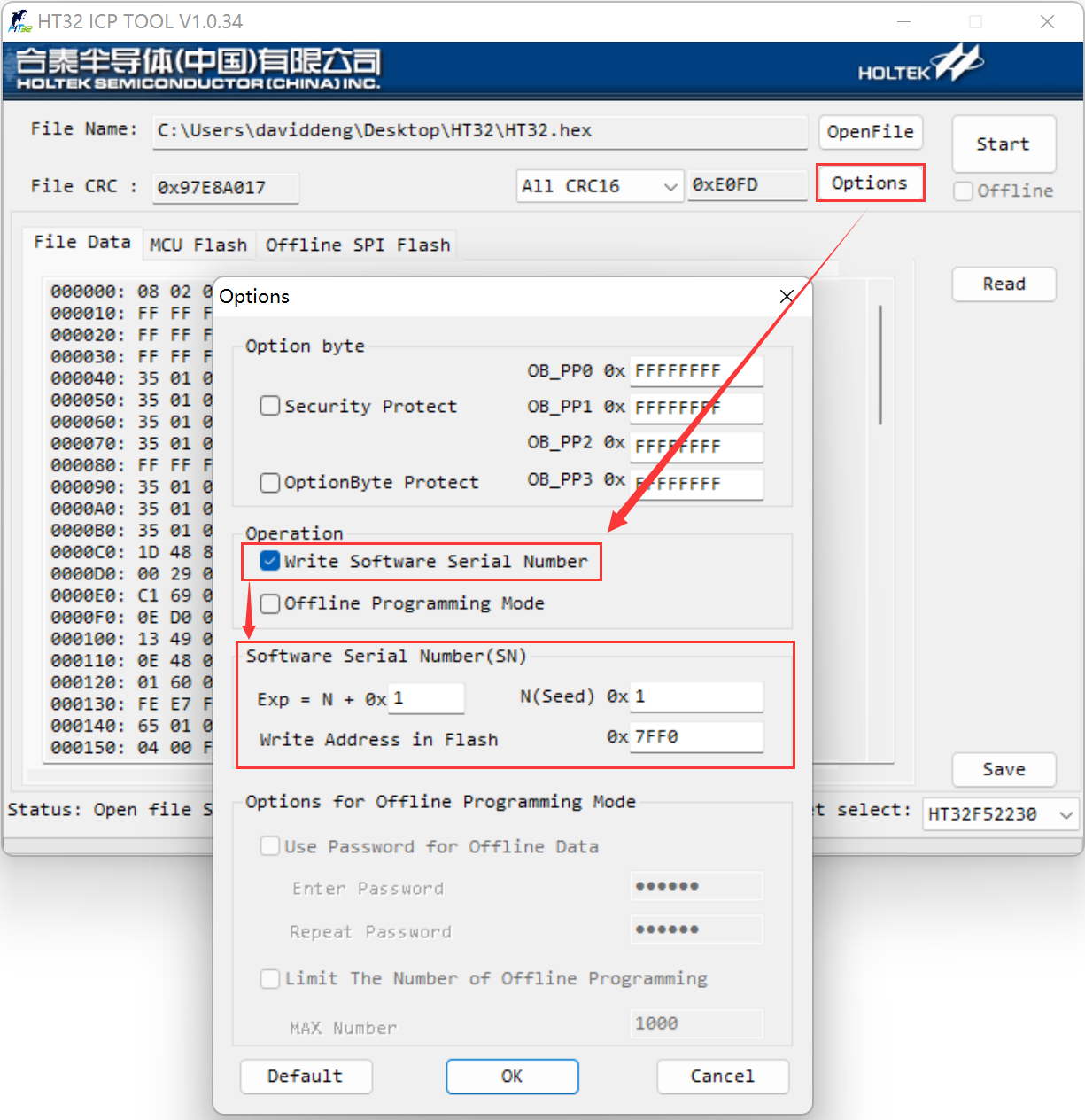 2. 打开 Options 选项,勾选 Write Software Serial Number,使能 Software Serial Number(SN) ,